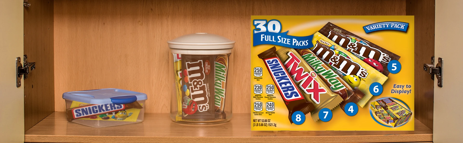 - Contains one (1) 53.66-ounce, 30-count box of full-size, individually wrapped (8) SNICKERS, (7) TWIX, (6) M&M’S Peanut Chocolate Candies, (5) M&M’S Milk Chocolate Candies and (4) MILKY WAY Chocolate Candy Bars