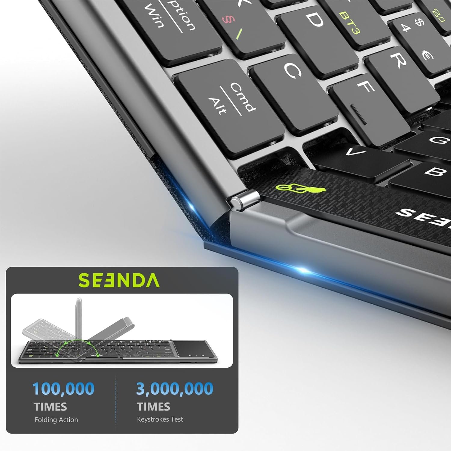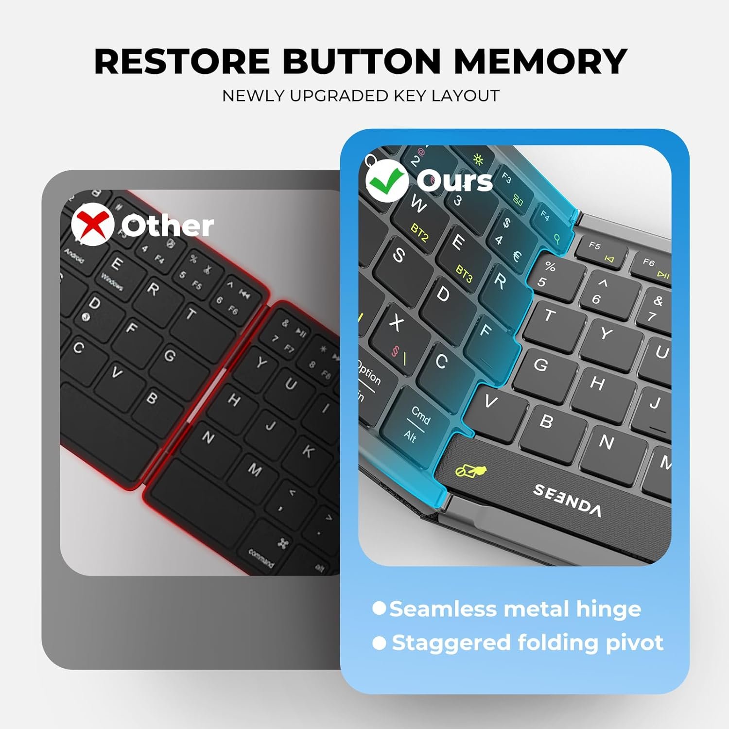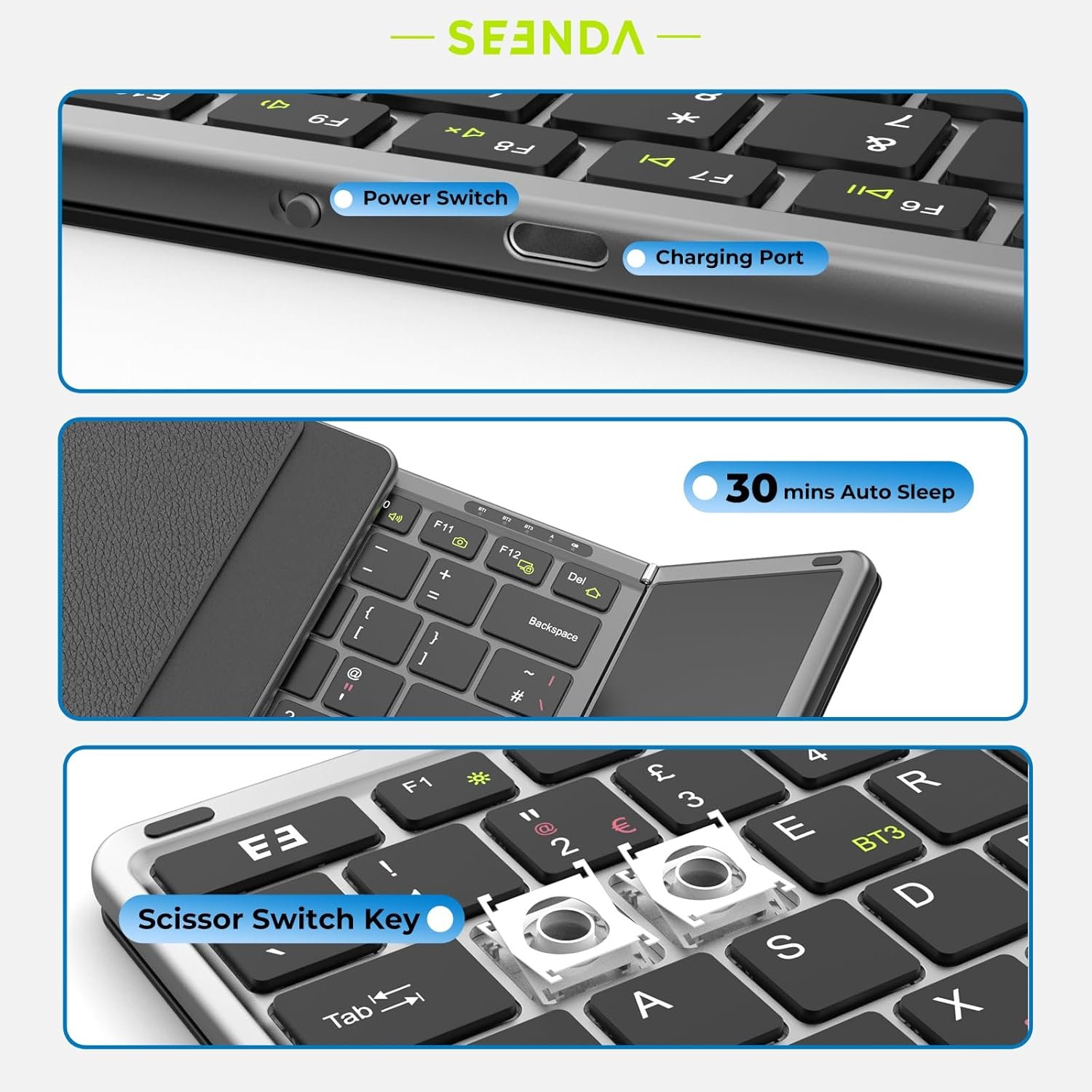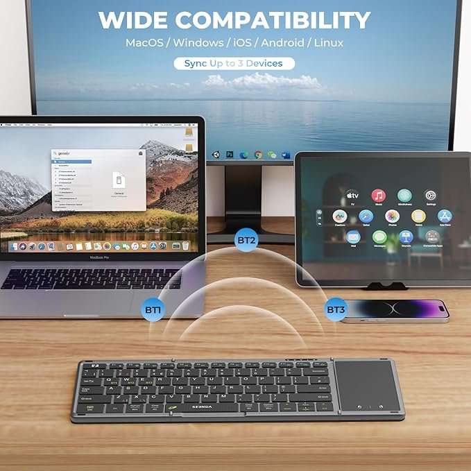 - Sync up to 3 Devices: Our Bluetooth folding keyboard can be connected up to 3 devices simultaneously via 3 bluetooth channels(BT1/BT2/BT3). Press Fn+BT1/BT2/BT3 to freely switch between connected devices . Compatible with Windows, Mac OS, iOS or Android device, you can work with your ipad, phone, tablet or laptop seamlessly.